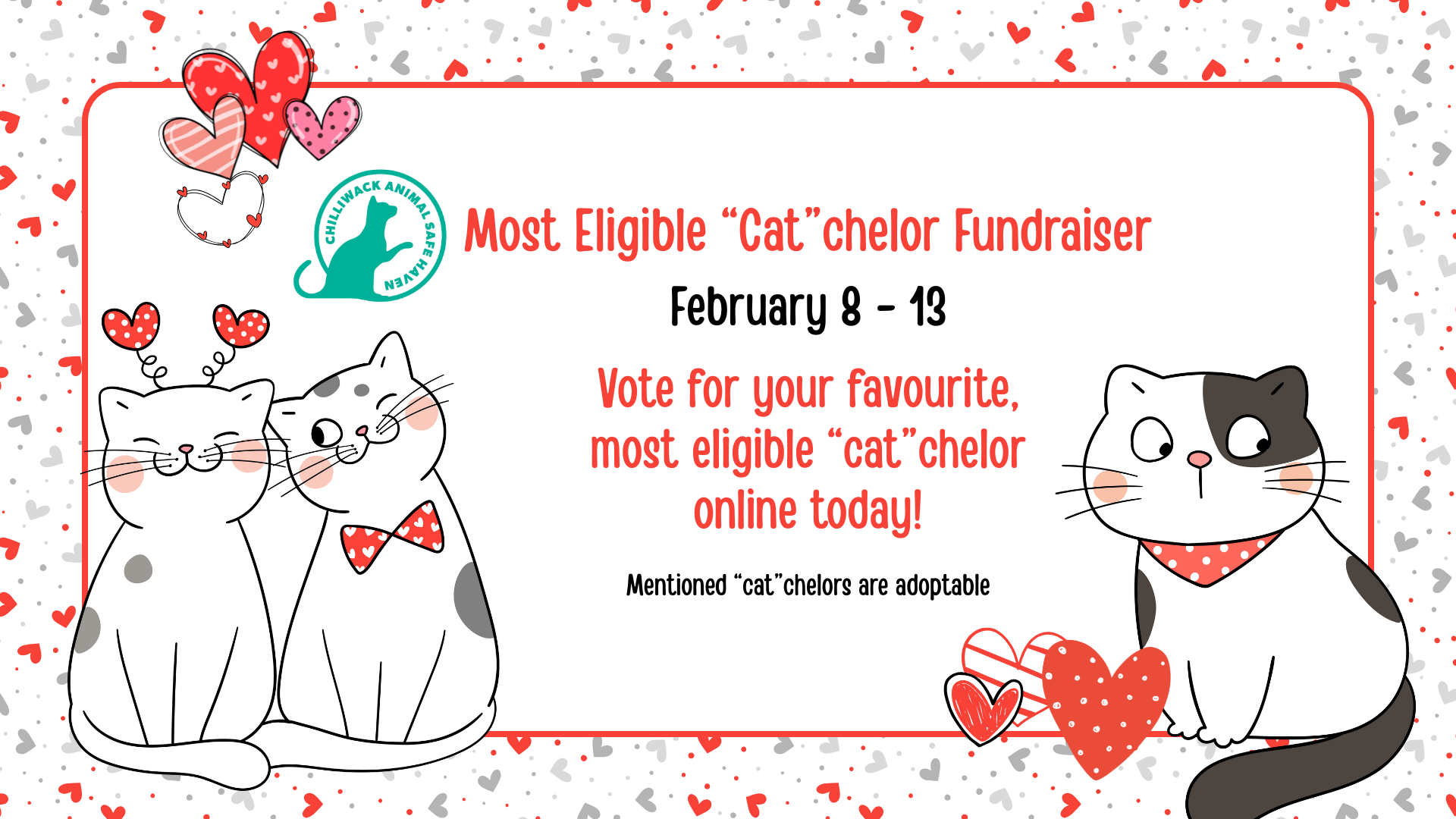​Vote for your favourite “Cat”chelor today. We will announce who raises the most funds on Valentines Day.